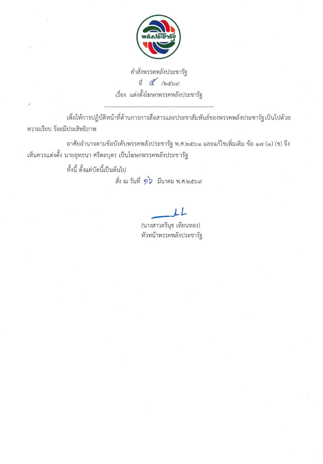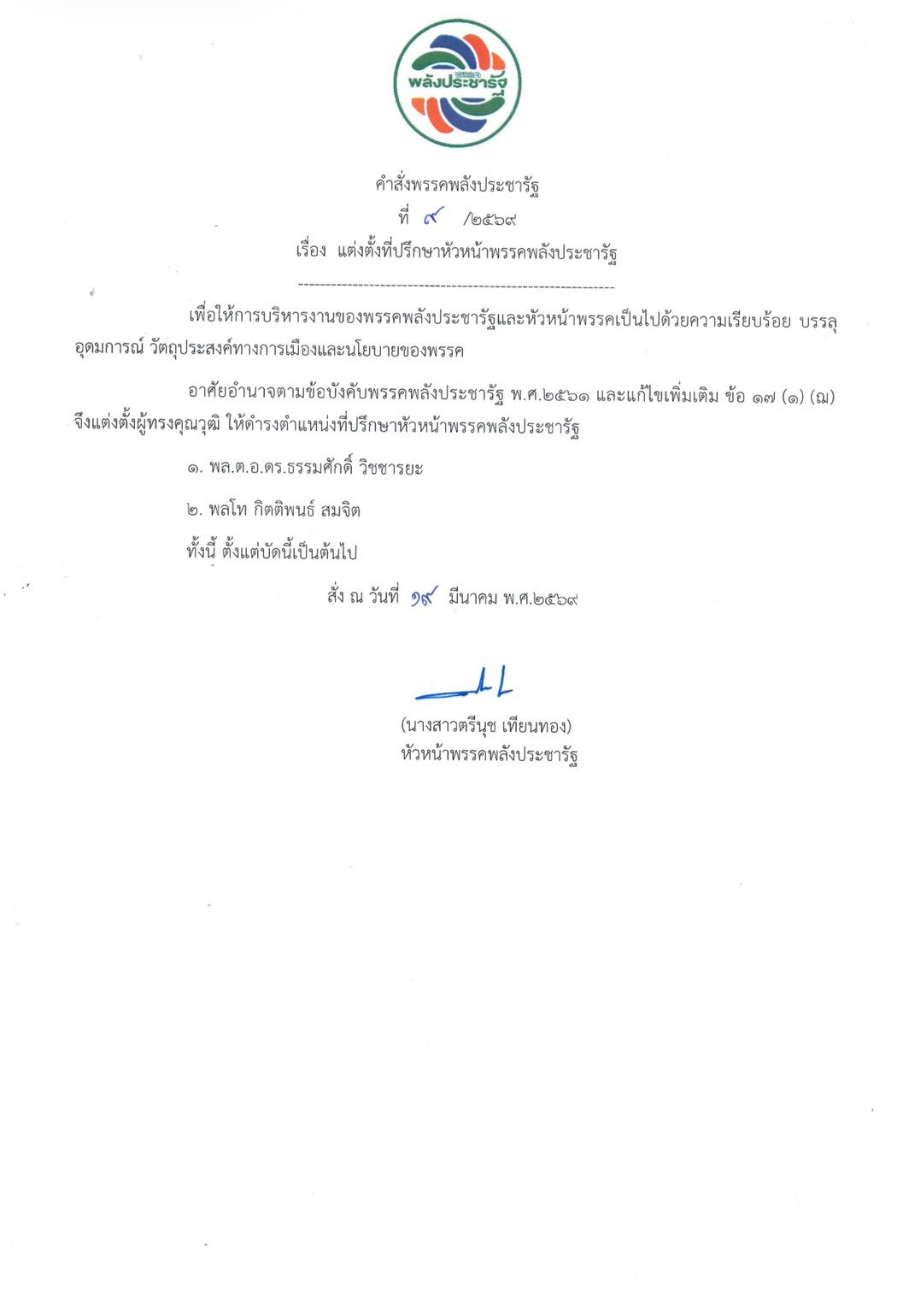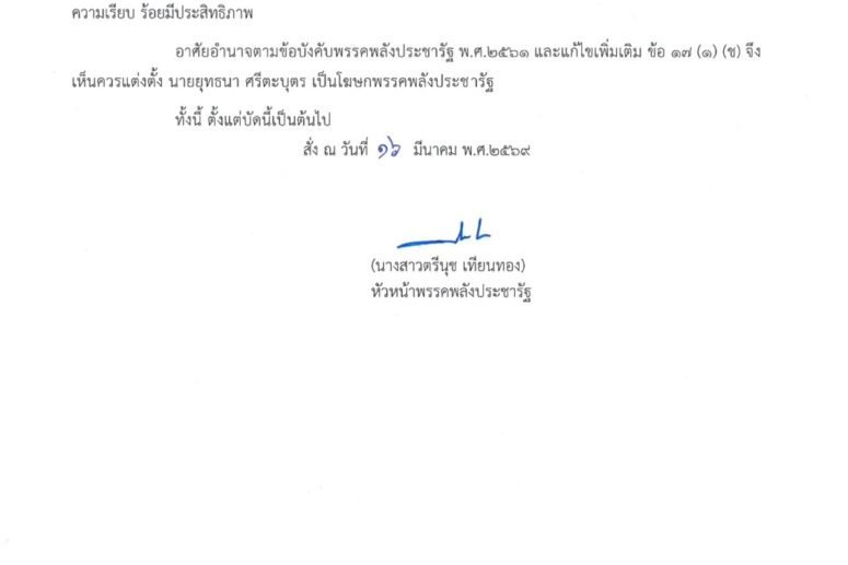 มีนาคม 20, 2026 คำสั่งพรรคพลังประชารัฐประกาศตำแหน่ง มีผลตั้งแต่วันที่ ๑๖ มีนาคม ๒๕๖๙ Share on Social Media twitter facebook pinterest linkedin tumblr