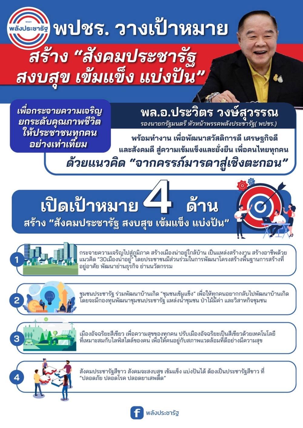วันที่ 29 ตุลาคม 2565 พล.อ.ประวิตร วงษ์สุวรรณ รองนายกรัฐมนตรี และ หัวหน้าพรรคพลังประชารัฐ (พปชร.) เปิดเผยว่า พปชร.มีนโยบายที่จะขับเคลื่อน “ สังคมประชารัฐ สงบสุข เข้มแข็ง แบ่งปัน” ซึ่งเป็น 1 ใน 3 พันธกิจหลักเพราะเชื่อว่าชุมชนแต่ละชุมชนในประเทศไทย มีศักยภาพที่จะพัฒนาประเทศไปพร้อมๆกันได้ ซึ่งนโยบายรัฐที่ตอบสนองและส่งเสริม ความสามารถของชุมชนจะนำมาซึ่ง สังคมคุณภาพ ที่สะท้อนความเป็นอยู่ที่ดีของคนไทยทั้งประเทศ โดยโครงสร้างของสังคมประชารัฐ จะเป็นการกระจายอำนาจไปยังภูมิภาคต่างๆ ทั่วประเทศไทย ไปพร้อมองค์ความรู้ และเงินลงทุนในการเริ่มต้นพัฒนาความเป็นอยู่ ตั้งแต่พื้นที่ทำกิน การสร้างอาชีพ รวมไปถึงการส่งเสริมวัฒนธรรมชุมชน