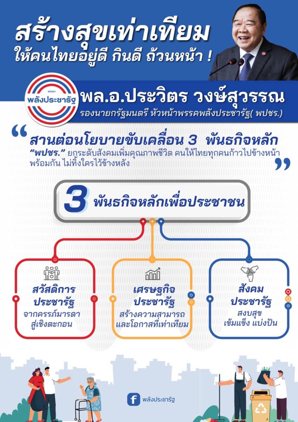 วันที่ 14 พ.ย. 2565 พล.อ.ประวิตร วงษ์สุวรรณ รองนายกรัฐมนตรี และหัวหน้าพรรคพลังประชารัฐ (พปชร.) เปิดเผยว่า พรรคพลังประชารัฐได้มีการวางนโยบายขับเคลื่อนและสานต่อ 3 พันธกิจหลัก ที่ประกอบด้วย สวัสดิการประชารัฐ :ขจัดความเหลื่อมล้ำ เศรษฐกิจประชารัฐ :สร้างความสามารถและโอกาสที่เท่าเทียม และสังคมประชารัฐ : สงบสุข เข้มแข็ง แบ่งปัน ซึ่งเป็นนโยบายเพื่อช่วยเหลือประชาชน อย่างต่อเนื่อง เพื่อทำนโยบายที่สอดรับกับความต้องการประชาชน และการเลือกตั้งที่จะมาถึงในอนาคต เป็นการมุ่งเน้นในการยกระดับคุณภาพชีวิตให้กับพี่น้องประชาชนให้กินดี อยู่ดี ล่าสุดพรรคได้ดำเนินการแต่งตั้งคณะกรรมการขับเคลื่อน 3 พันธกิจ ที่ประกอบไปด้วย 1.ศ.ดร.นฤมล ภิญโญสินวัฒน์ 2.นายสุรสิทธิ นิธิวุฒิวรรักษ์ 3.นายสุรพร ดนัยตั้งตระกูล4. นายพรชัย ตระกูลวรานนท์ 5.นายชวน ชูจันทร์ 6. นายนัทธี ถิ่นสาคู 7.นายอรรถกร ศิริลัทธยากร 8.น.ส.ธณิกานต์ พรพงษาโรจน์ 9.นายชาญกฤช เดชวิทักษ์ 10.ดร.สุรดา จุนทะสุตธนกุล11. ดร.ปรมะ บุญเขื่อง