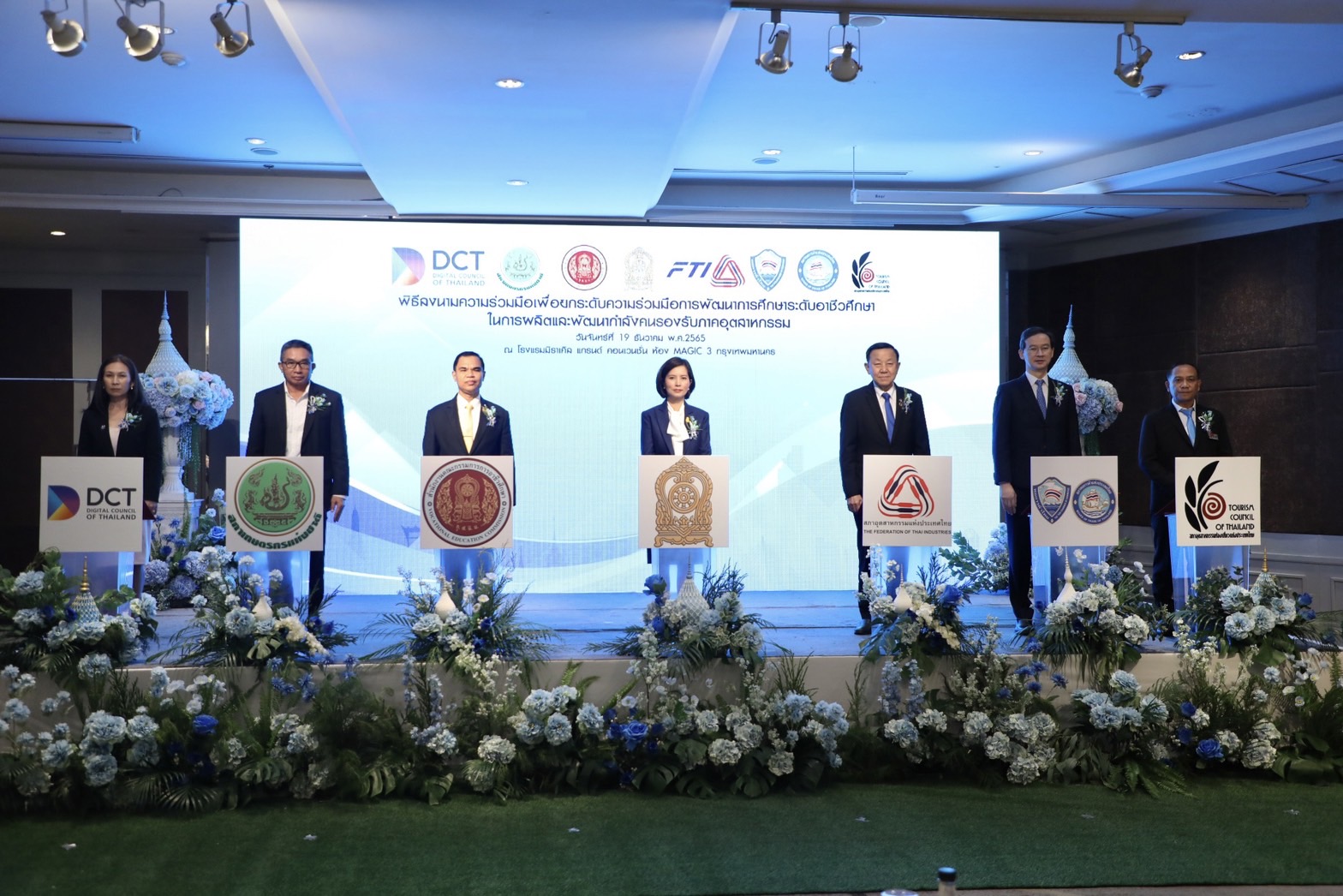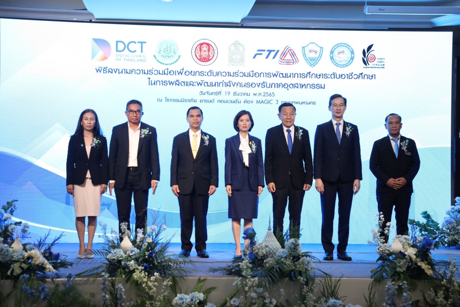 วันนี้ 19 ธันวาคม 2565 ณ โรงแรมมิราเคิล แกรนด์ คอนเวนชั่น กรุงเทพมหานคร นางสาวตรีนุช เทียนทอง รัฐมนตรีว่าการกระทรวงศึกษาธิการ (รมว.ศธ.) เป็นประธานในพิธีลงนามความร่วมมือเพื่อยกระดับความร่วมมือการพัฒนาการศึกษาระดับอาชีวศึกษาในการผลิตและพัฒนากำลังคนรองรับภาคอุตสาหกรรม ระหว่าง สำนักงานคณะกรรมการการอาชีวศึกษา กับ สภาอุตสาหกรรมแห่งประเทศไทย สภาหอการค้าแห่งประเทศไทย สภาอุตสาหกรรมท่องเที่ยวแห่งประเทศไทย สภาเกษตรกรแห่งชาติ และสภาดิจิทัลเพื่อเศรษฐกิจและสังคมแห่งประเทศไทย
