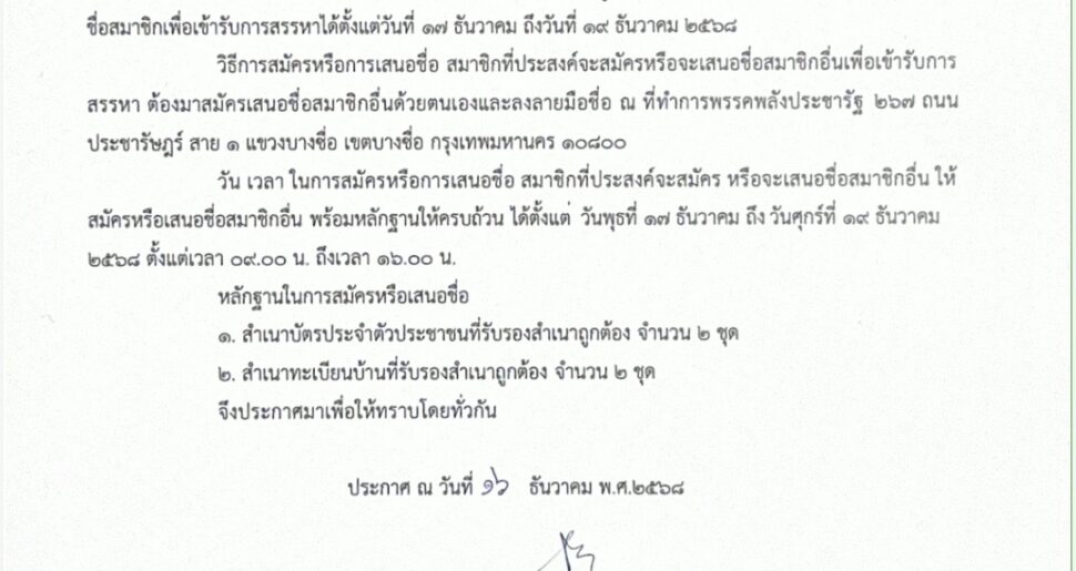 สมาชิกที่ประสงค์จะสมัคร หรือจะเสนอชื่อสมาชิกอื่น ให้สมัครหรือเสนอชื่อ พร้อมยื่นหลักฐานให้ครบถ้วน ตั้งแต่วันพุธที่ ๑๗ ธันวาคม ถึงวันศุกร์ที่ ๑๙ ธันวาคม พ.ศ. ๒๕๖๘ ระหว่างเวลา ๐๙.๐๐ น. ถึงเวลา ๑๖.๐๐ น.